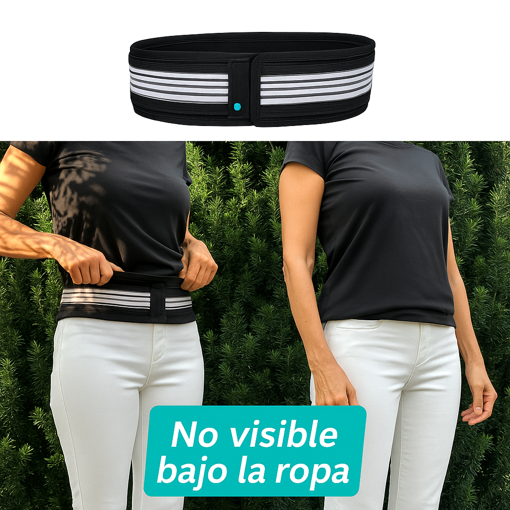 Solo colócalo alrededor de tus caderas, ajústalo con los velcros laterales y siente cómo estabiliza tu zona lumbar y pelvis. Es tan delgado que lo puedes usar bajo la ropa sin que se note. Ideal para uso diario, en casa o al caminar.
