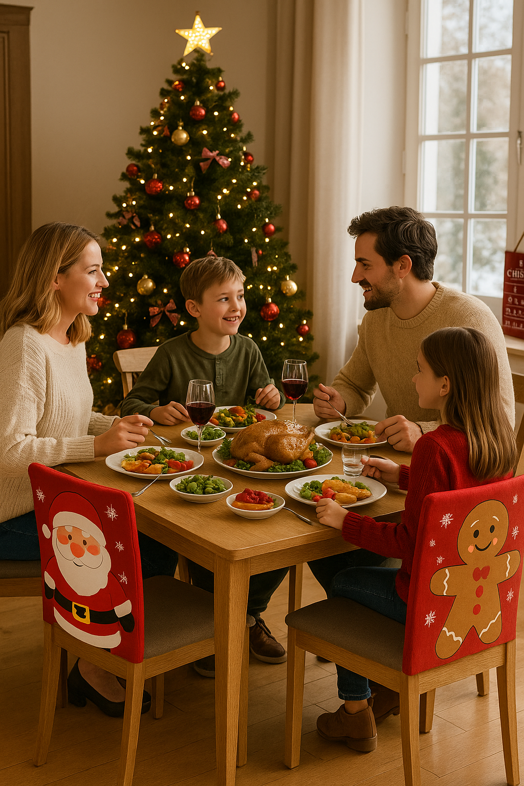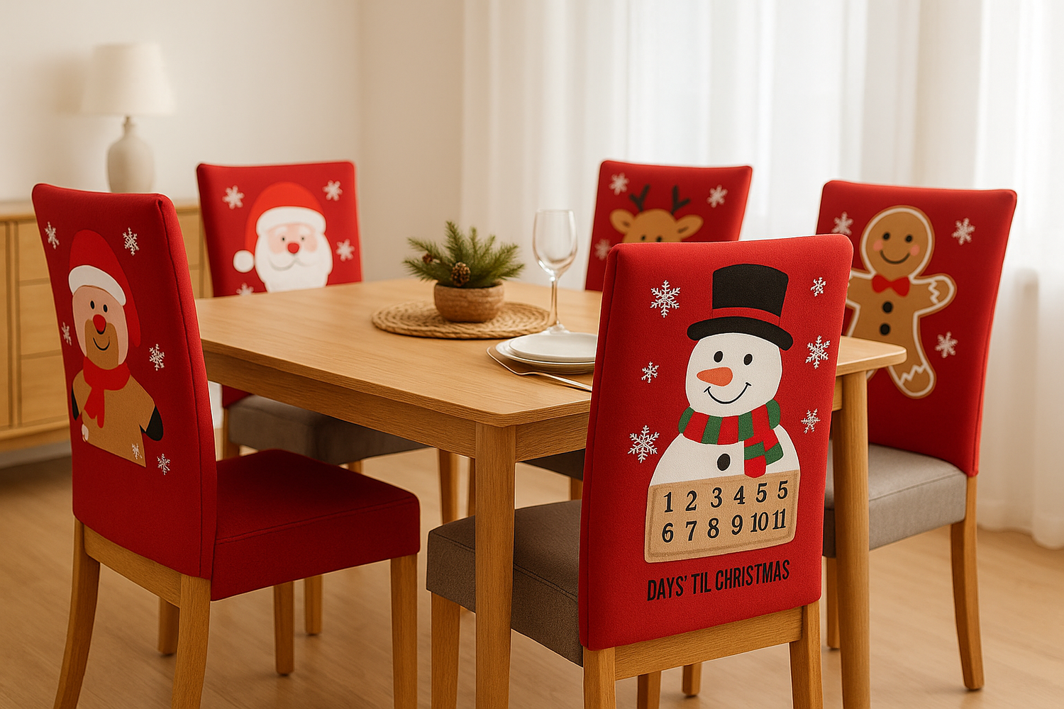 Cada funda trae un diseño navideño distinto para que cada silla luzca única en diciembre. Al terminar la temporada, solo volteas el forro y todas las sillas quedan iguales en un color neutro sobrio, elegido por ti. Así decoras sin complicarte.