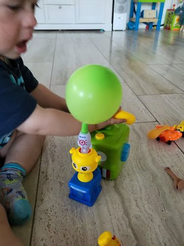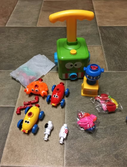 Este juguete consta de cuatro componentes: bomba, coches, globos y extras (según el paquete). El globo se fija al coche y luego se conecta a la bomba. Con la palanca, se infla. Finalmente, se presiona el botón de la bomba, liberando una pequeña cantidad de aire del globo. Esto hace que el coche avance. El niño aprende aquí la tercera regla de movimiento de Isaac Newton: por cada acción hay una reacción opuesta equivalente. ¡ El aire sale de la parte trasera del coche mientras este avanza!